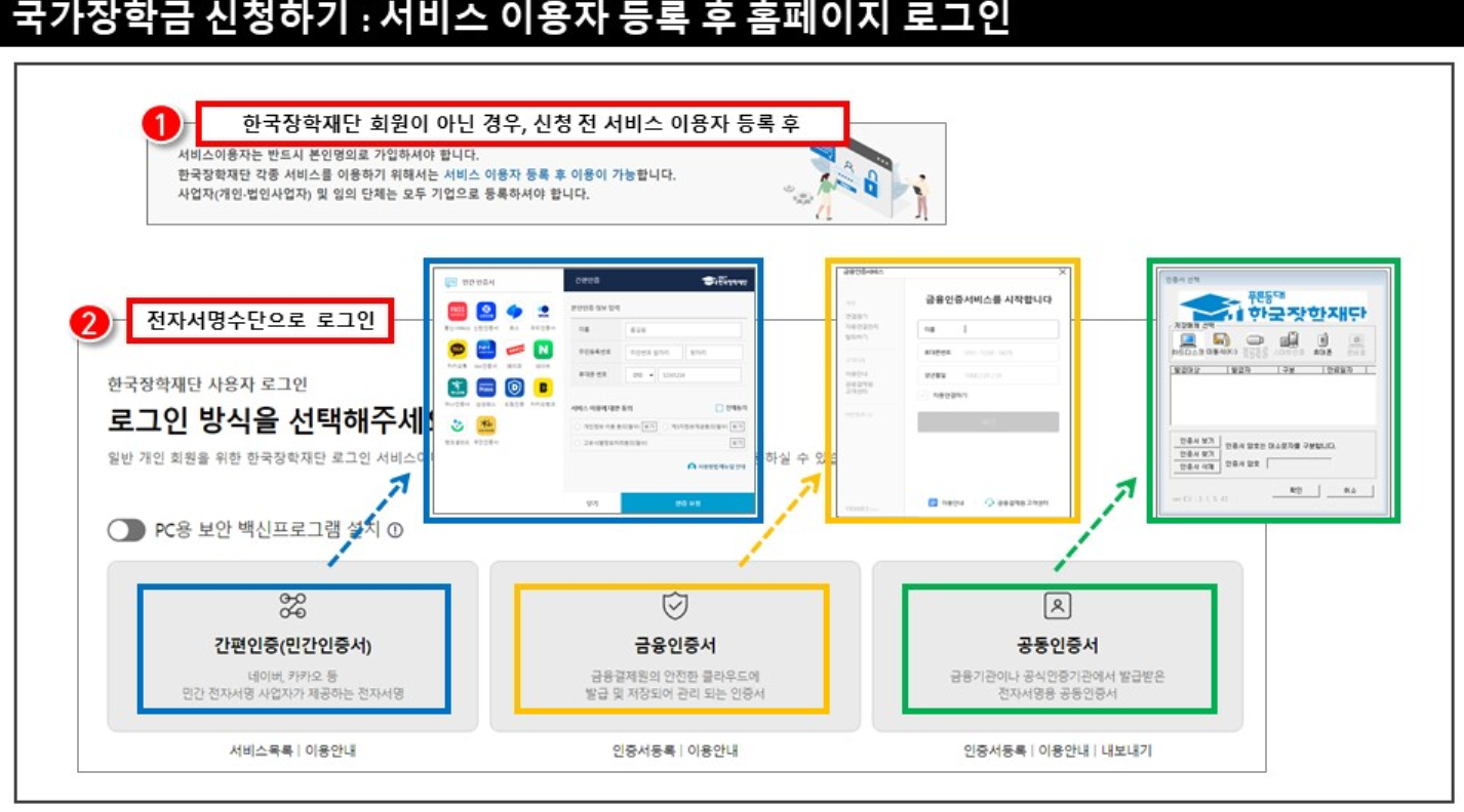 부모 명의 인증서는 사용할 수 없으며, 모든 신청 과정은 학생 본인의 계정에서 진행해야 합니다.