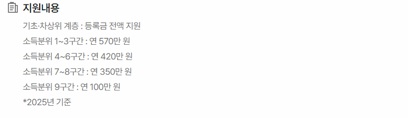 2025년 기준 지원액(2026학기 동일 적용 예정)은 아래와 같습니다.