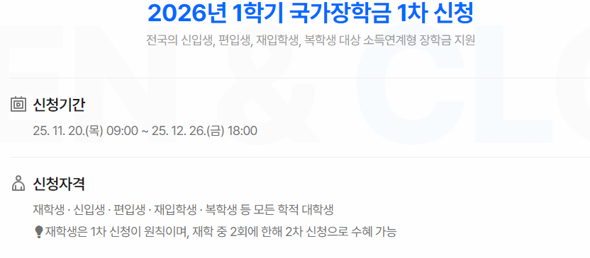 이번 2026년 1학기 국가장학금 1차 신청은 2025년 11월 말부터 본격적으로 시작되며, 등록금 지원이 필요한 모든 대학생이 참여할 수 있습니다.