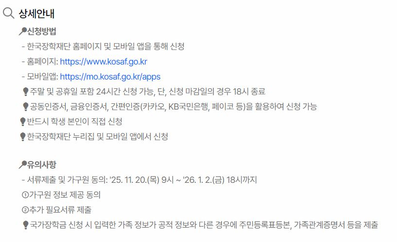 소득구간에 따라 최대 등록금 전액까지 지원받을 수 있으며, 중위계층까지 폭넓게 혜택이 제공되는 만큼 모든 대학생이 놓치지 말아야 할 제도입니다. 여유 있는 시점에 신청을 마치고, 서류 제출과 가구원 동의까지 빠짐없이 처리해야 장학금이 정상적으로 지급됩니다
