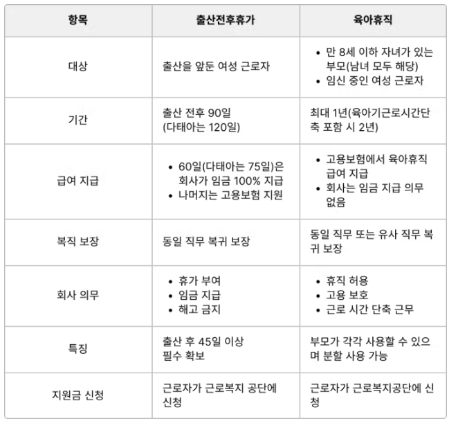 출산전후휴가, 출산전후 유급휴가, 배우자 출산휴가, 출산전후휴가 후 동일업무 등 복귀 보장