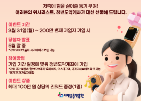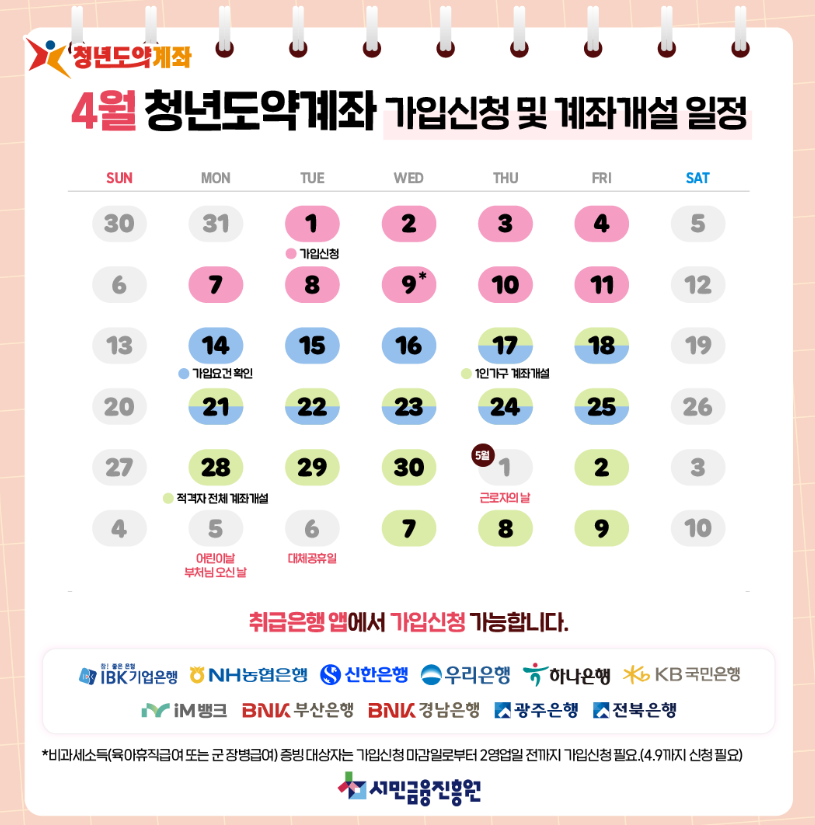 신청은 2025년 4월 1일부터 4월 11일까지 진행되며, 계좌 개설은 4월 17일부터 5월 9일까지 가능합니다. 이 기간 동안 신청을 원하시는 분들은 미리 준비해 두시기 바랍니다.