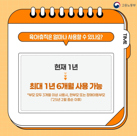 기존에는 부모 각각 최대 1년씩 사용할 수 있었지만, 2025년부터는 1년 6개월(18개월)로 연장되었습니다.