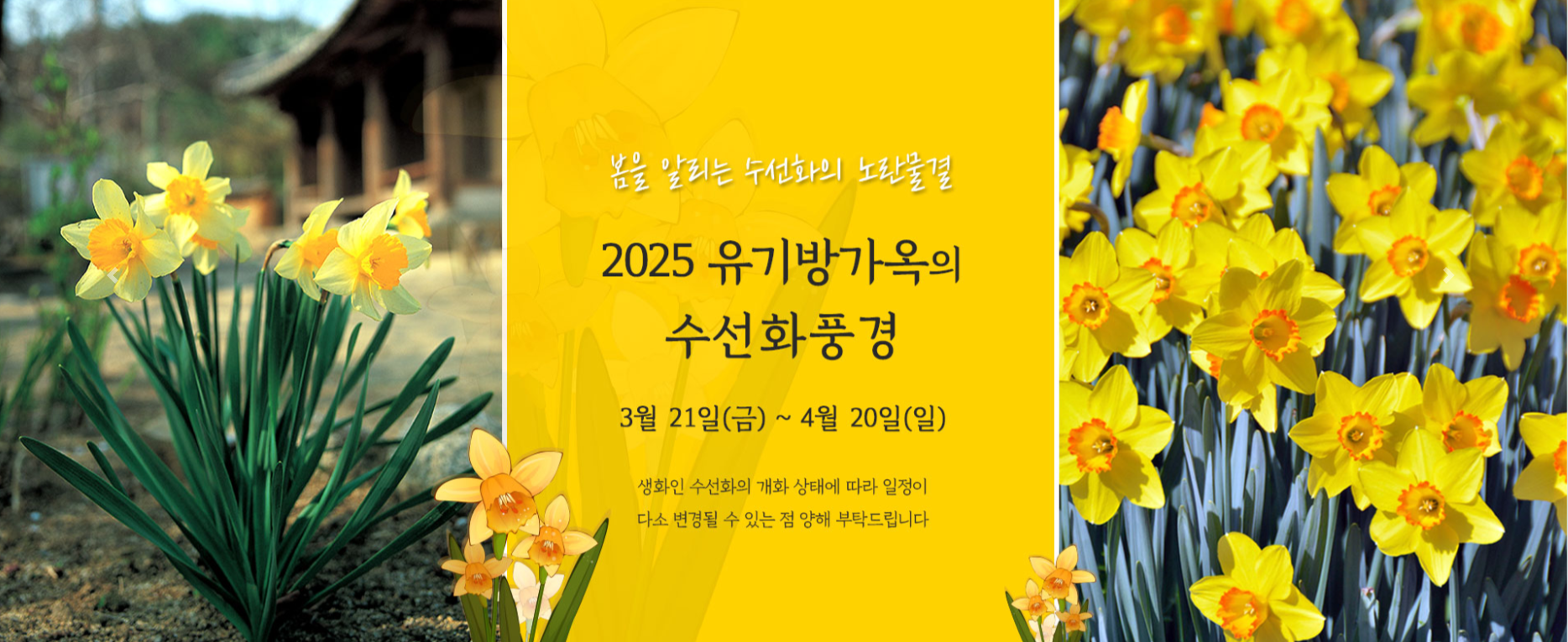 봄을 알리는 수선화의 노란물결 유기방가옥의 수선화축제인 수선화풍경은 매년 3월중순부터 4월중순까지 진행됩니다. 수선화축제이외에도 전통한옥인 유기방가옥을 관람하실 수 있으며, 전통