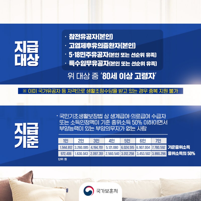 특이사항: 참전유공자 등록자 중 80세 이상인 경우 별도의 생계지원금이 지급됩니다.