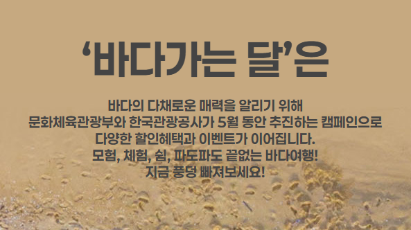 5월은 봄과 여름이 만나는 계절로 따뜻한 햇살과 시원한 바람이 불어오는 시기입니다. 자연스레 바다로 나가고 싶은 마음이 드는 시기인데요, 올해는 문화체육관광부와 해양수산부가 공동 주관하는 '바다가는 달' 캠페인이 5월 한 달간 전국 연안 및 어촌 지역을 중심으로 처음으로 개최되어 바다로 나갈 수 있는 좋은 기회가 찾아왔습니다.