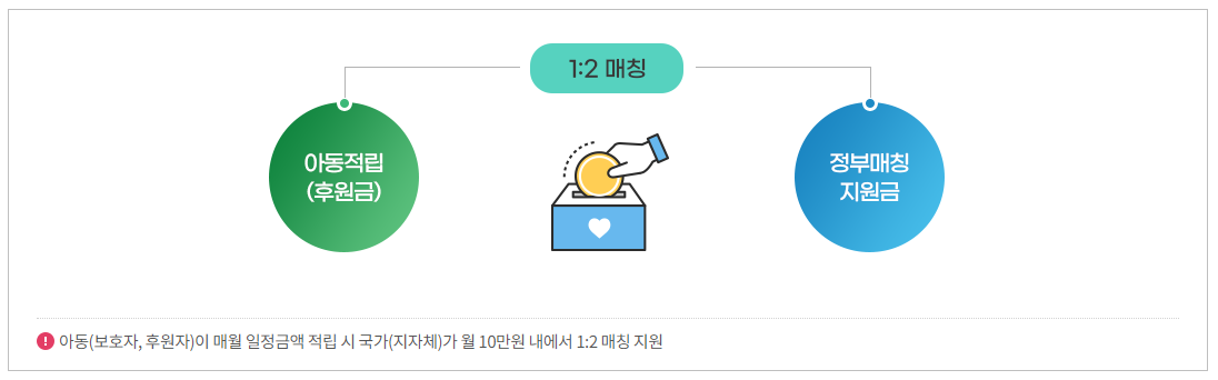 이 제도는 저소득층 아동이 성인이 되었을 때 자립을 위한 자금을 마련할 수 있도록, 부모가 저축하는 금액에 대해 정부가 최대 1:2 비율로 맞추어 적립해주는 제도입니다.