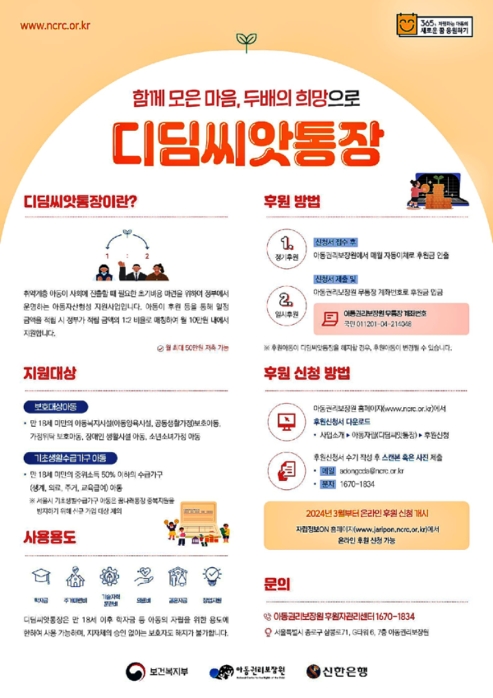 경제적 어려움 속에서도 아이들이 포기하지 않고 미래를 설계할 수 있도록 돕는 제도, 바로 디딤씨앗통장(아동발달지원계좌)이 있습니다. 저소득층 가정의 자산 형성을 정부가 함께 지원하며, 교육과 자립을 위한 든든한 기반을 마련해주는 이 통장은 단순한 저축 이상의 의미를 지닙니다. 오늘은 이 디딤씨앗통장이 무엇잇지, 가입 대상 및 절차 등 핵심 내용들을 알려드릴 예정입니다.