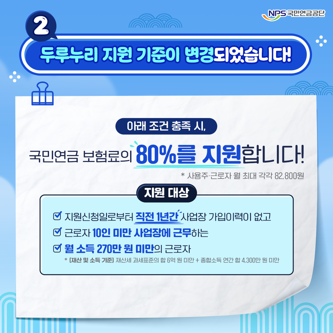국민연금 두루누리 지원사업: 월 소득 260만 원 미만 근로자의 경우 보험료의 최대 90%까지 지원