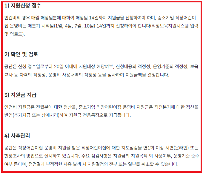 또한 의무설치 대상은 아니지만 복지를 강화하고자 자발적으로 어린이집을 설치하려는 기업도 지원 신청이 가능합니다. 단, 일정 요건을 갖춰야 하므로 사전에 관련 법령 및 세부지침을 참고해야 합니다.