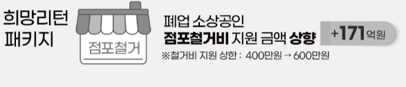 점포 철거비 지원: 점포 정리에는 철거비, 원상복구비 등 생각보다 큰 비용이 발생합니다. 이 부분을 일정 금액까지 지원해주는 제도입니다.