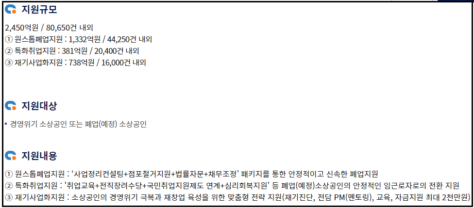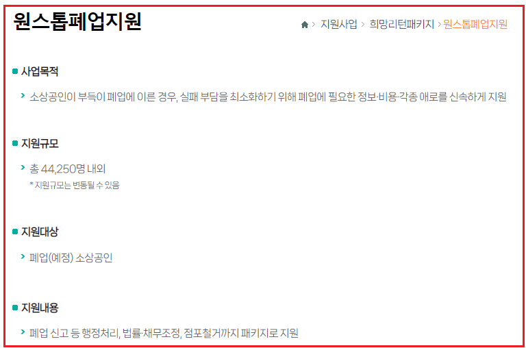 정리 컨설팅: 세무·노무·회계·법률 등 전문가의 도움을 받아 폐업 절차를 합리적으로 진행할 수 있도록 도와줍니다.