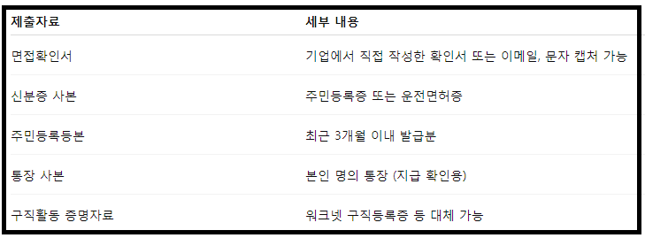 ※ 면접확인서는 기업 담당자가 서명한 간단한 양식으로도 충분하며, 문자로 받은 면접 통보 내역 등도 인정되는 경우가 많아 부담 없이 제출할 수 있습니다.