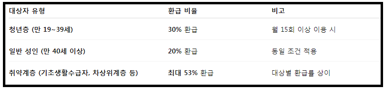 환급 방식: 교통비의 일정 비율을 실사용액 기준으로 환급 (카드 청구 할인 또는 계좌 지급 등)